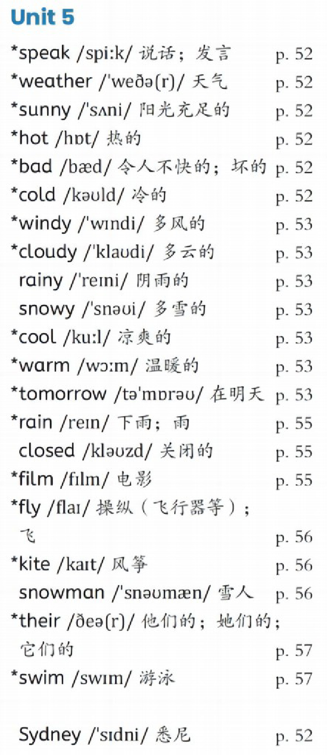 PEP四年级上册unit5单词